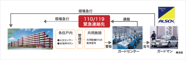異常信号を受信すると、ガードセンターのスタッフは状況に応じて的確に判断を下し、ガードマンに現場急行を指令します。24時間、共用施設や住戸内の安全を見守るシステムです。