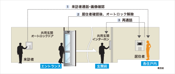 エントランス・サブエントランスへの来訪者を、鮮明なカラー映像で確認してからオートロックを解錠できるカラーモニター付オートロックシステムを導入。不審者の入館を防止します。さらに、各住戸の玄関前に設置されたインターホンでも音声で来訪者を確認できます。